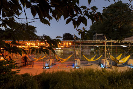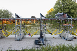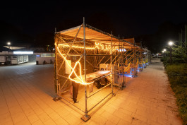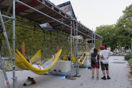 Tagsüber sieht es aus wie ein überdachter Gang. Abends verwandelt es sich in ein gemütliches Mini-Kino. Die Besucher:innen können sich in Hängematten legen und Filme anschauen. Der Ton kommt über Kopfhörer. Das Kino ist kostenlos.